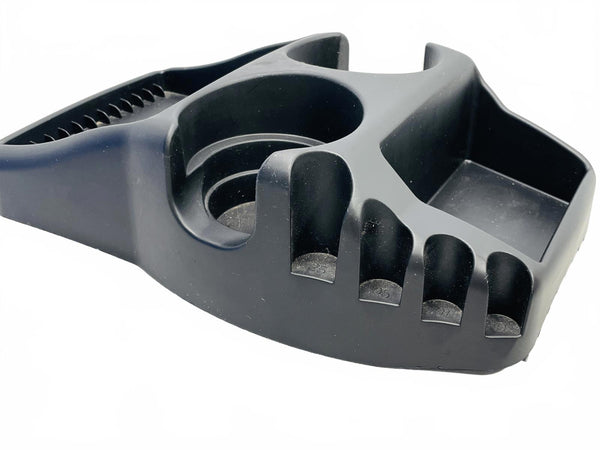 Black plastic truck console organizer designed to hold various supplies. Features multiple compartments including two drink holders, a large rectangular tray with ridged edges to hold cds, keys or phone and additional slots for loose change. Sturdy construction and practical design help keep your truck tidy and organized.