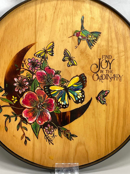 Handpainted images of butterflies, hybiscus flowers and a cresecent moon with hummingbirds