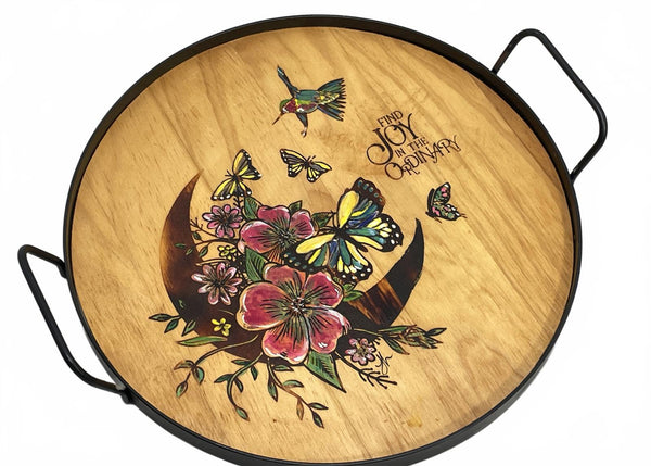 Handmade Handpainted Graphic Round Tray Wooden with Metal Handles Butterflies