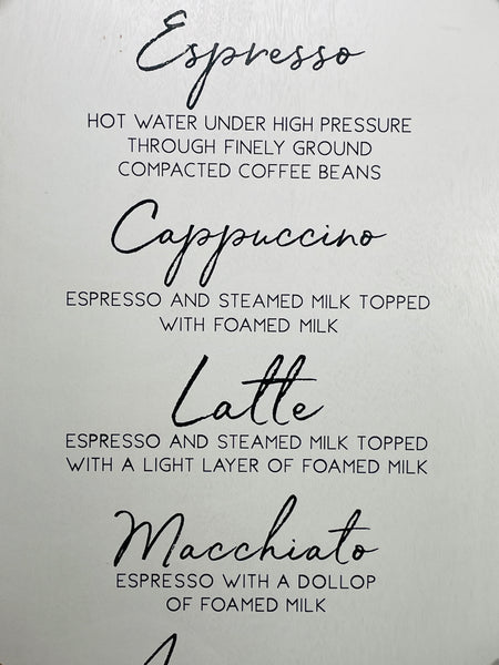NEW! Wall Art Wooden COFFEE GUIDE Espresso Cappuccino White Wash Wood 16" x 24"