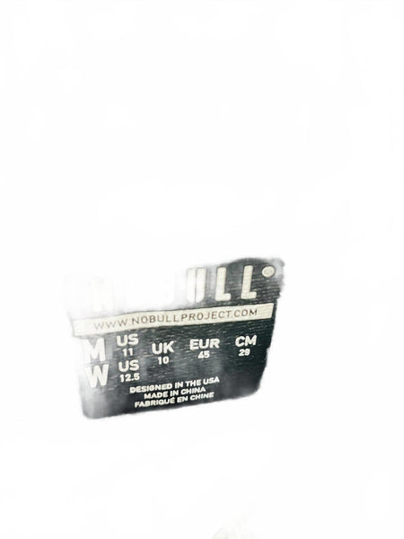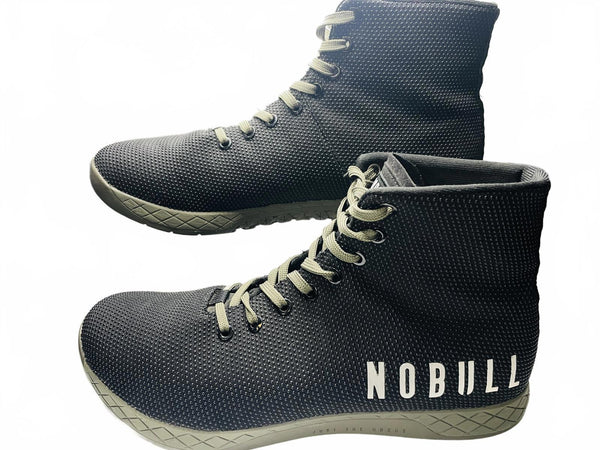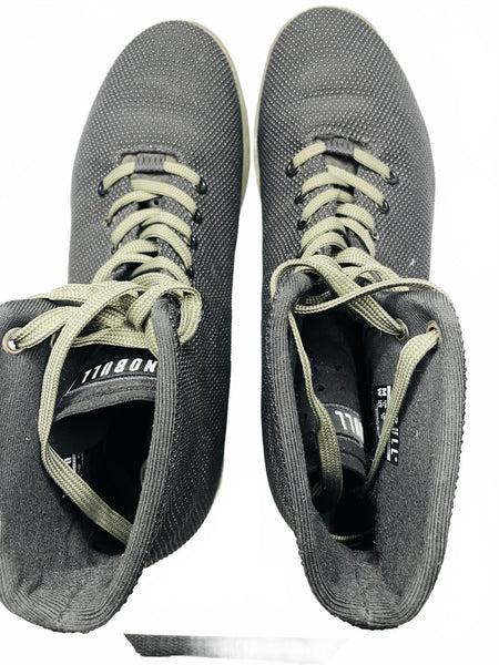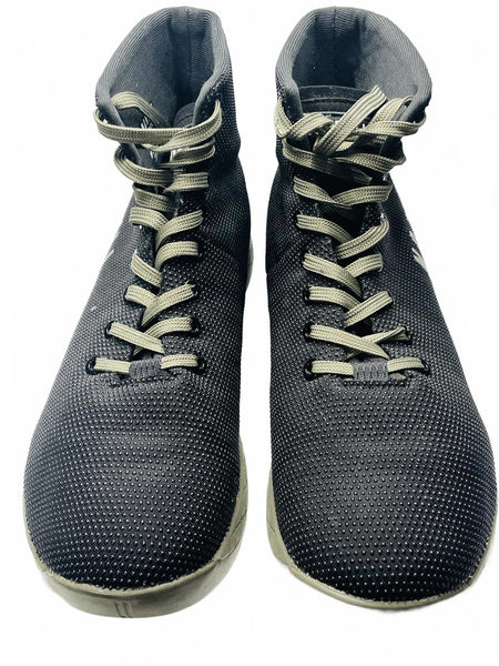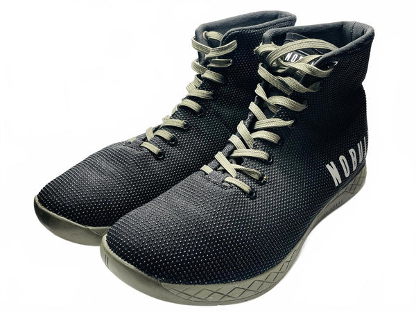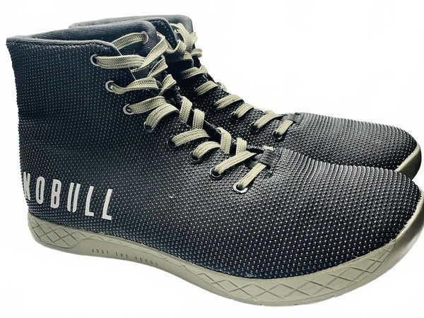 Army Green Laces and Soles NOBULL high-top training shoes featuring a breathable black mesh upper with white accents. Durable rubber outsole with excellent traction for versatile training activities. Lightweight and flexible design provides comfort and support during workouts. Classic lace-up closure for a secure fit.