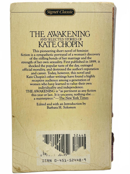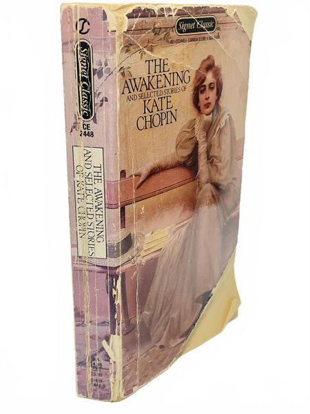 This paperback edition of "The Awakening and Selected Stories of Kate Chopin" is a classic literary work. The book features a collection of feminist short stories and the pioneering novel "The Awakening," first published in 1899. It offers a sympathetic portrayal of a woman's discovery of self and societal challenges. The paperback shows signs of wear including creases, scuffs, and some damage to the cover, but the text remains intact and readable.