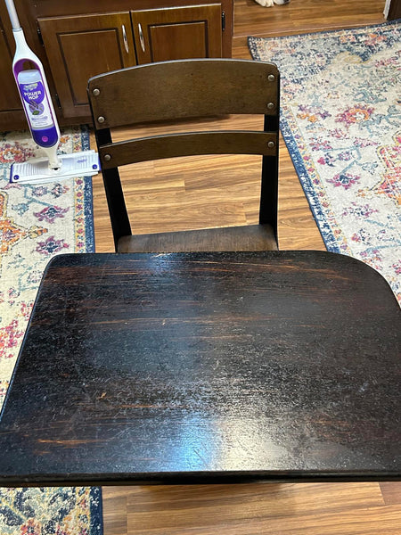 This vintage wooden school desk chair features a dark wood finish with a sturdy metal frame. It includes a spacious storage compartment beneath the seat, perfect for books or supplies. The desk surface is generously sized, with a smooth finish ideal for writing or reading. A classic piece suitable for home or office use, adding a nostalgic touch to any space.